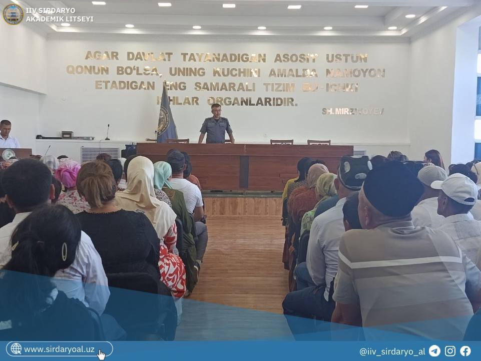 Joriy yilning 2-sentyabr kuni IIV Sirdaryo akademik litseyida 2025/2026-o‘quv yilida 1-bosqichga qabul qilingan o‘quvchilarning ota-onalari bilan yig‘ilish tashkil etildi. Yig‘ilishga litsey direktori, polkovnik F.Q.Ortiqboyev raislik qildi.