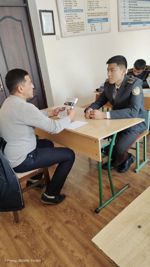 Joriy yilning 17-noyabr sanasida sertifikat imtihoniga tayyorlanayotgan talabgorlar uchun IIV Sirdaryo akademik litseyi ingliz tili fani o‘qituvchilari Mirzaqulov Elyor va Raxmonov Oybek tomonidan Speaking Mock imtihoni tashkil etildi.