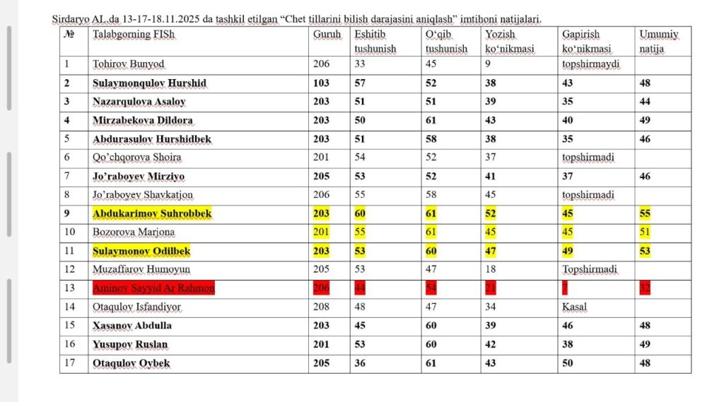 Imtihon yakunida o‘quvchilar 13 noyabr kunidagi imtihon va bugungi natijalari bilan tanishtirildi.