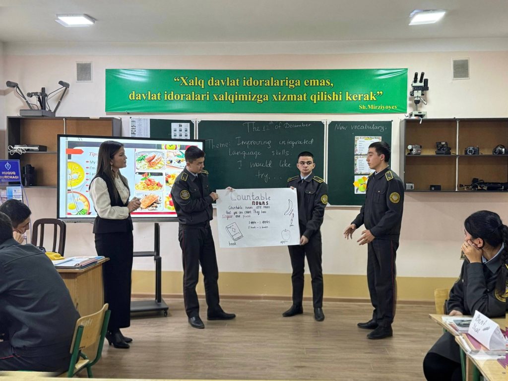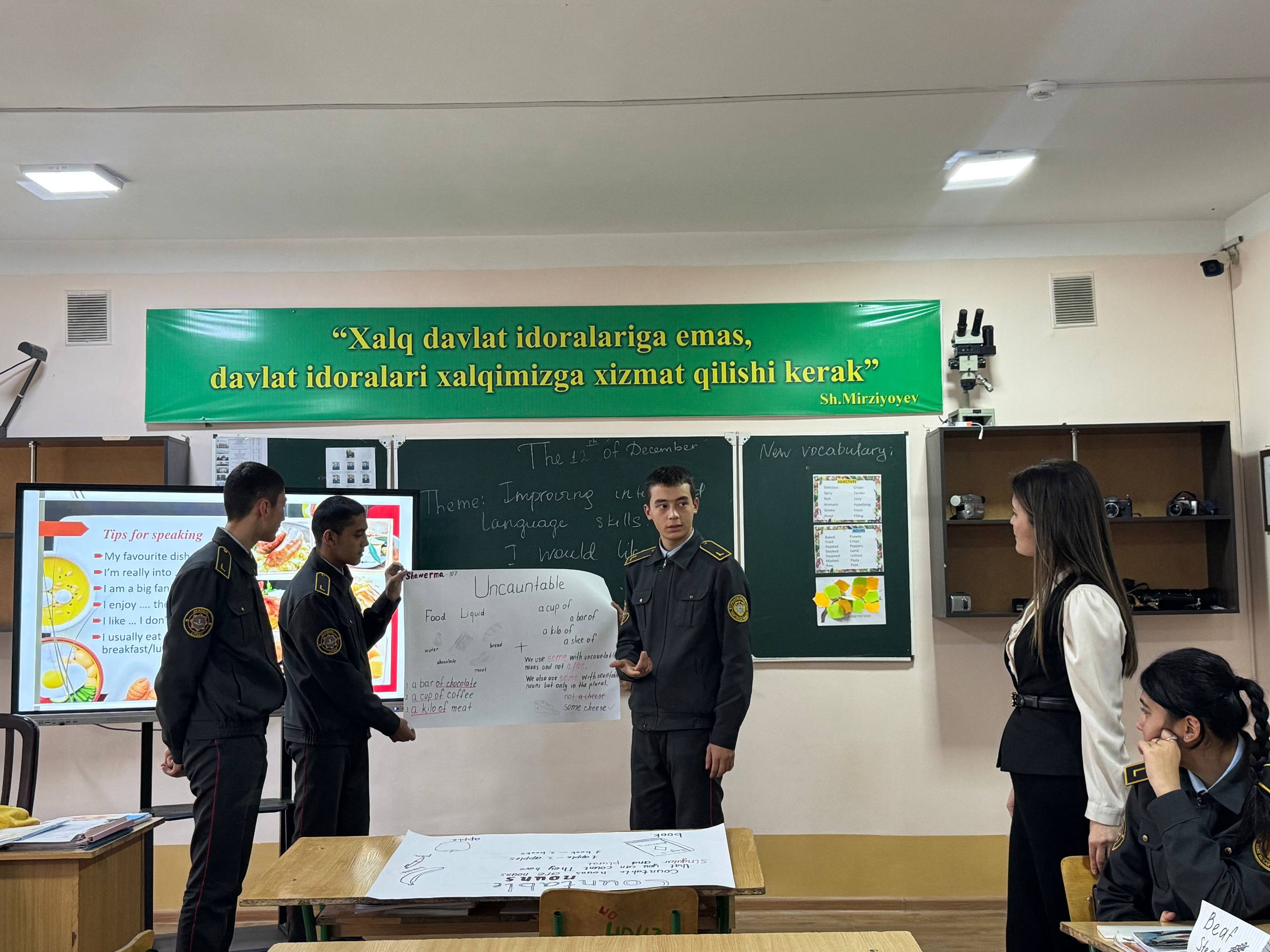 Joriy yilning 12-dekabr kuni IIV Sirdaryo akademik litseyi “Tillarni o‘rganish” kafedrasi ingliz tili fani o‘qituvchisi Sitora Raxmanova tomonidan 107-guruhda “Improving integrated language skills” mavzusida ochiq dars o‘tkazildi.