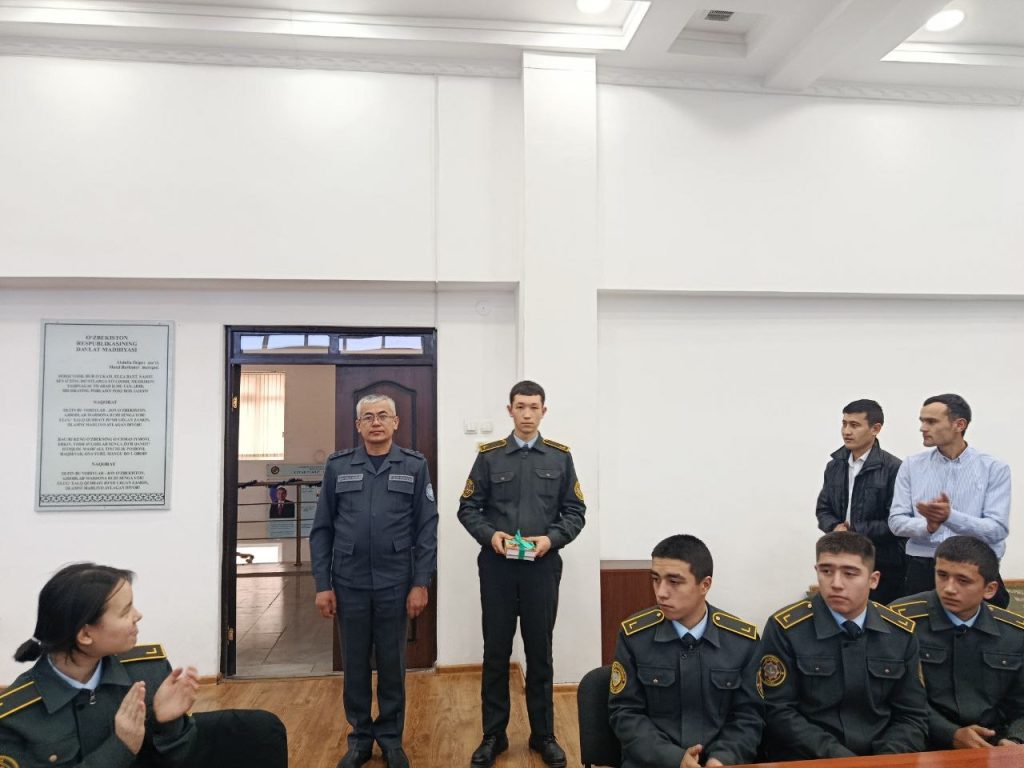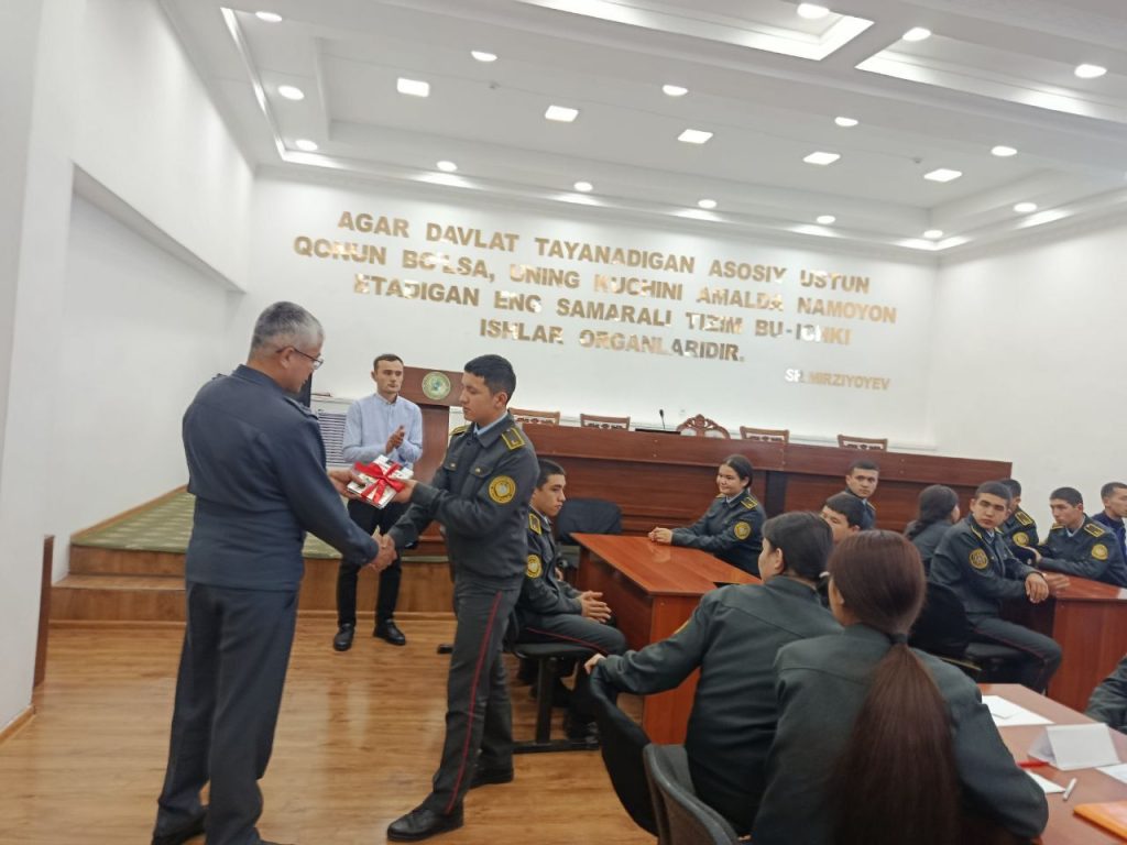 Huquqshunoslik fan oyligi doirasida Ichki ishlar vazirligi Akademiyasi Ichki ishlar organlarining maʼmuriy faoliyati kafedrasi boshlig‘i, yuridik fanlar nomzodi, professor podpolkovnik Qodirov Umidjon Abdumuratovich, shu kafedraning katta o‘qituvchisi, yuridik fanlari bo‘yicha falsafa doktori mayor Nishanov Eldorjon Muzaffarovich, Sirdaryo viloyati IIB Tergov boshqarmasi kadrlar bilan ishlash guruhi katta inspektori mayor Bekmurodov Abduvohid Abdumannon o‘g‘li, hamda Sirdaryo tumani IIB boshlig‘i podpolkovnik Abdullayev Oybek Turg‘unovichlar ishtirokida “Zakovat” intellektual o‘yini tashkil etildi.