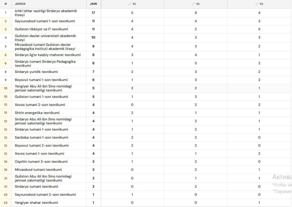 🥇- o’rin: Ichki ishlar vazirligi Sirdaryo akademik litseyi;